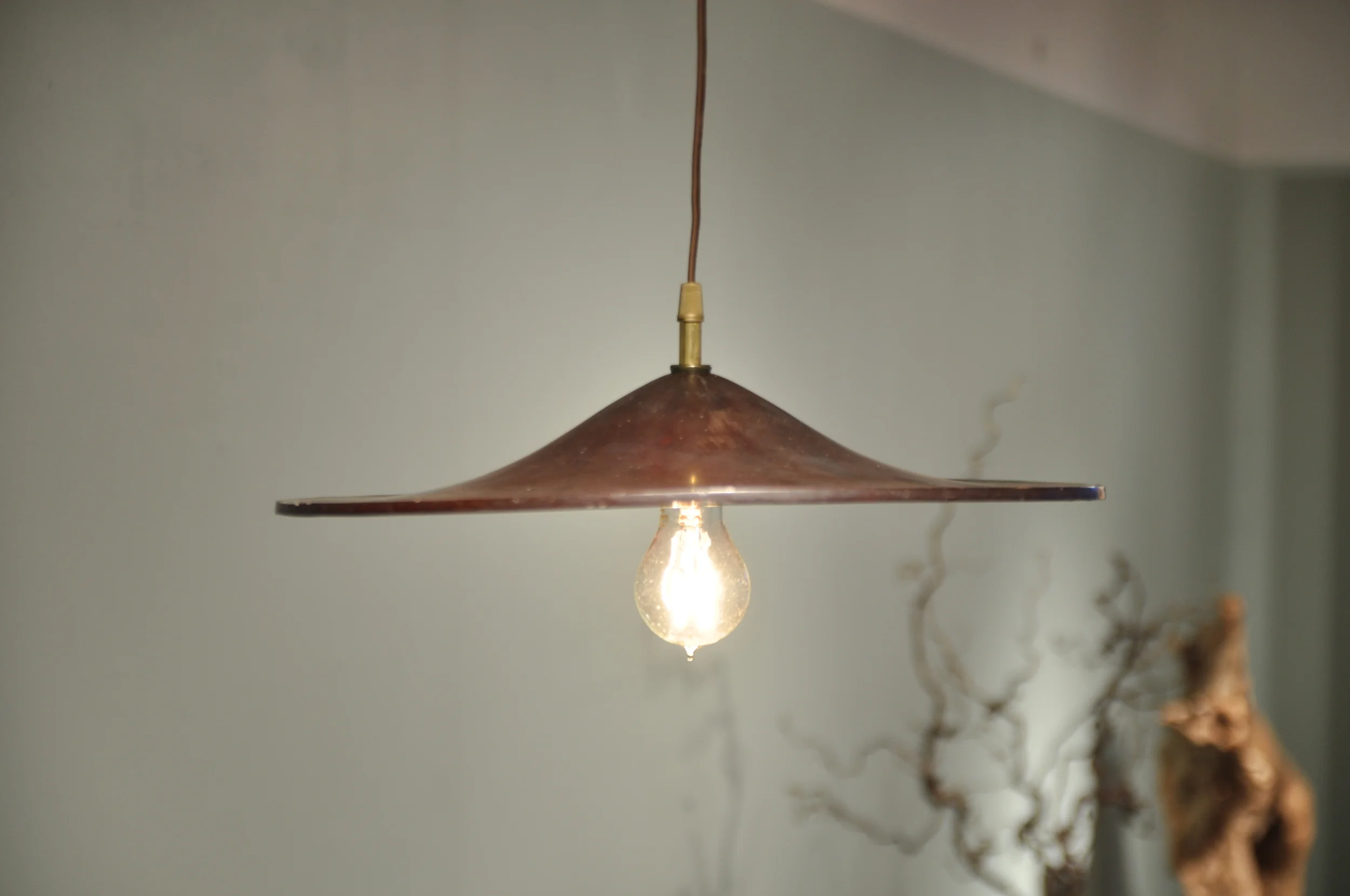 a 19th century "jingasa" or Samurai hat, is repurposed to become a hanging pendant lamp.